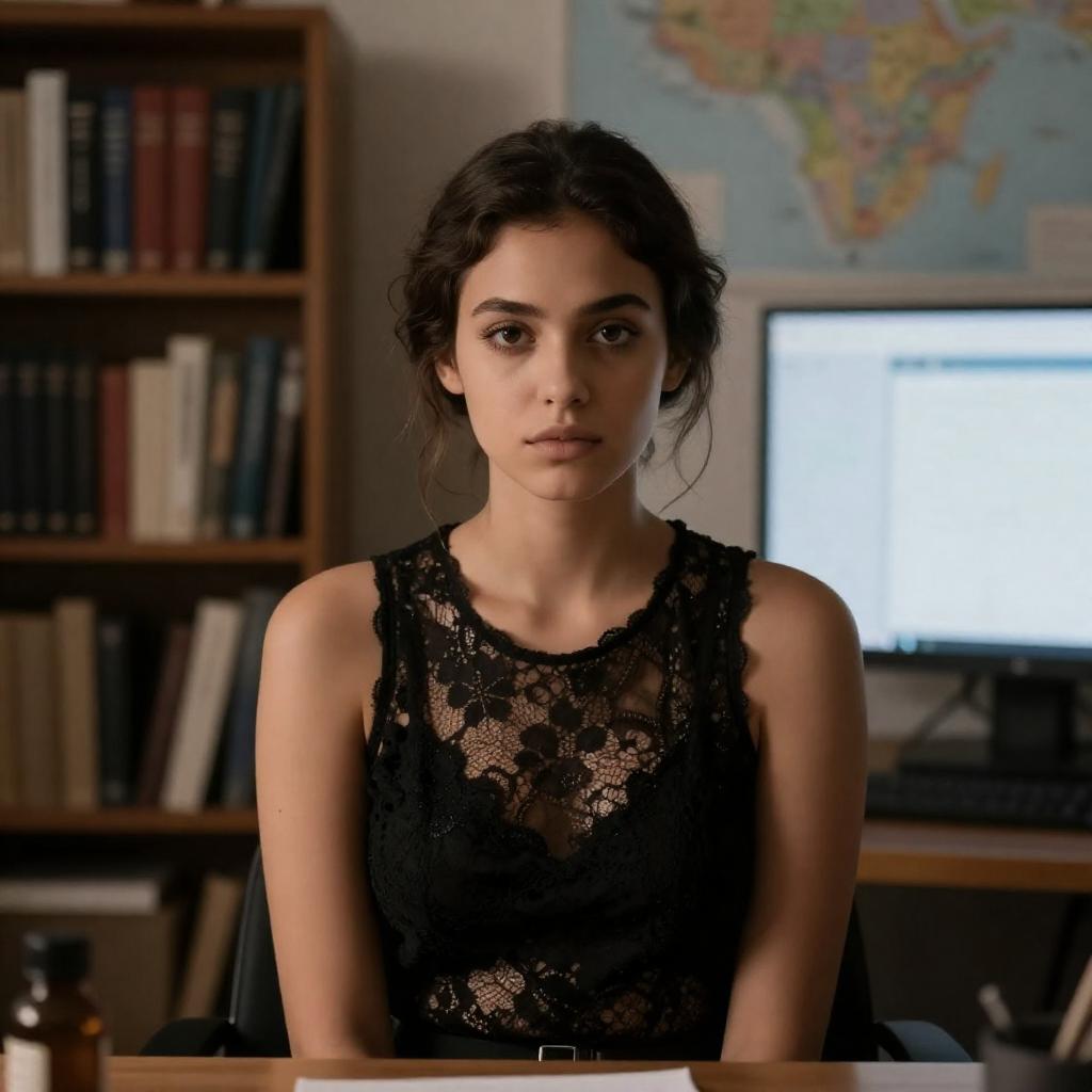 A photograph of a young woman with light brown skin and wavy brown hair, wearing a dark sweater, sitting at a wooden desk. She rests her hands on an open notebook, looking slightly to the right with a thoughtful expression. A blue book and a dark cloth are on the desk. The background is dimly lit with a potted plant and a chair.