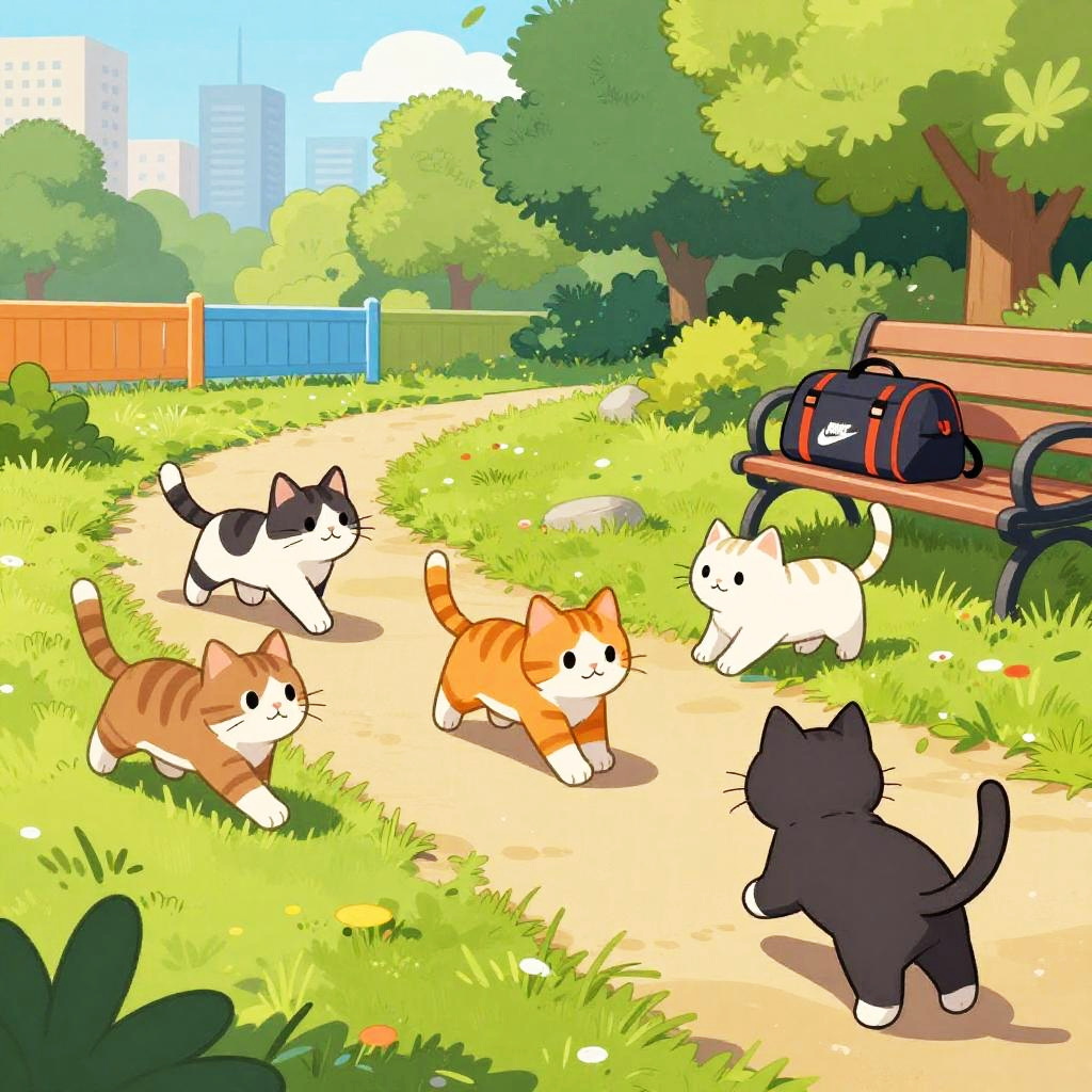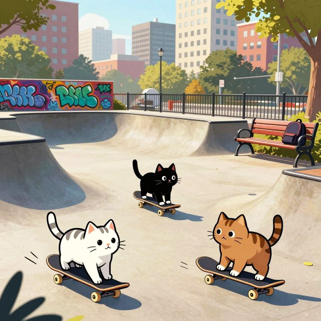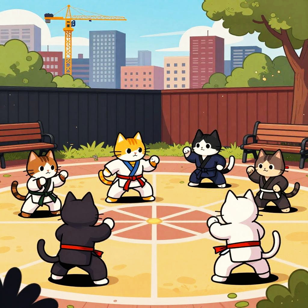 Comic book style illustration of cats practicing martial arts on a city park martial arts area, vibrant colors. Background includes city skyline with cranes, black and dark red fence, bench with skateboard, playful and energetic