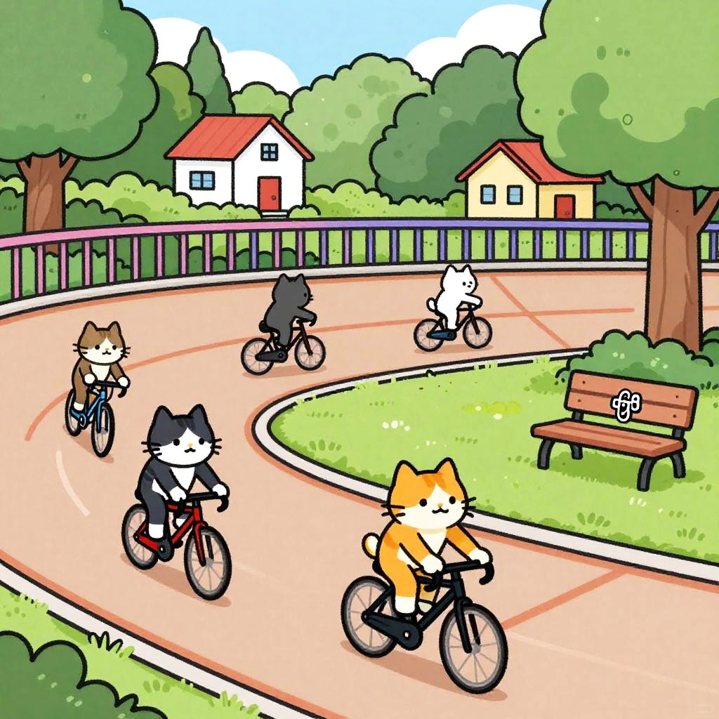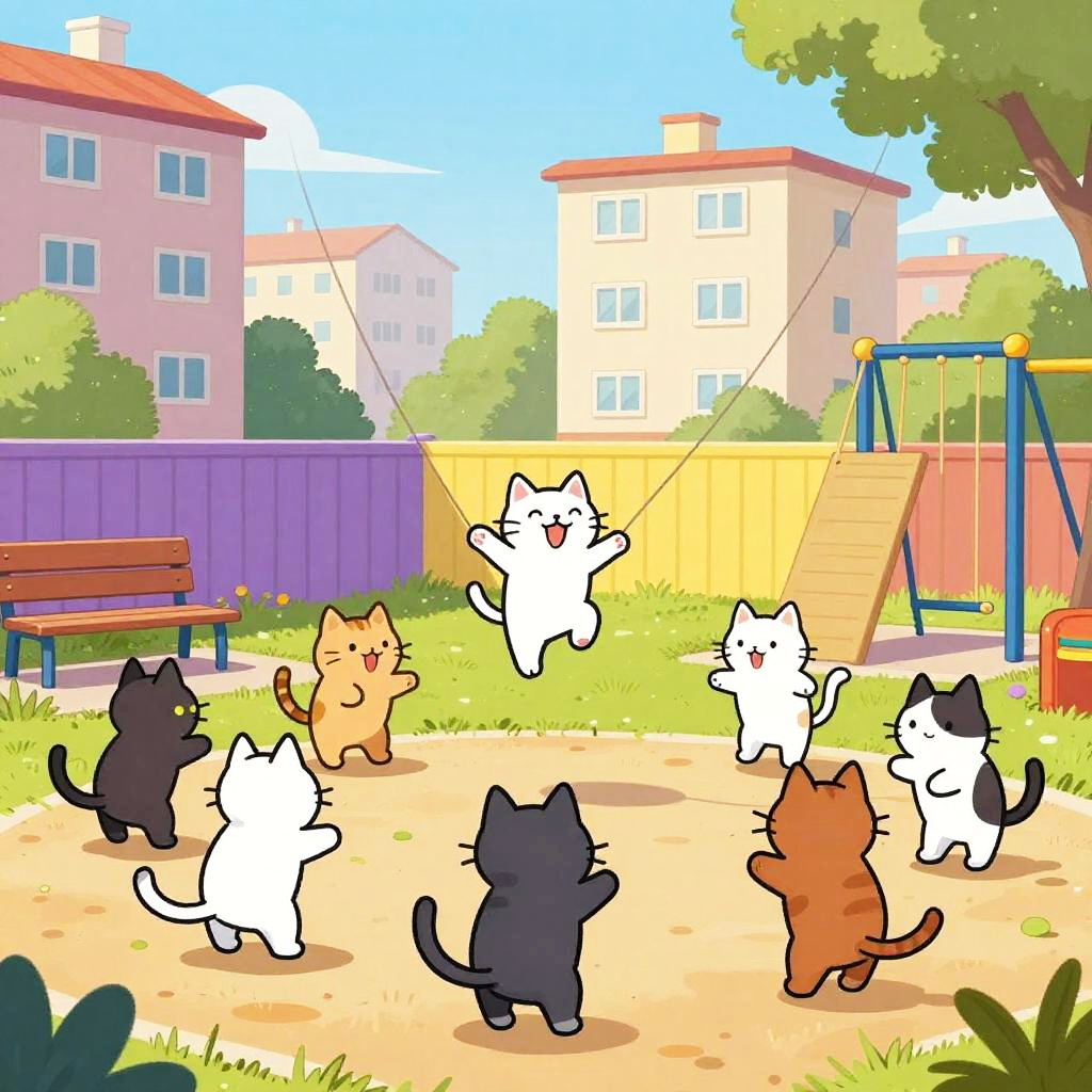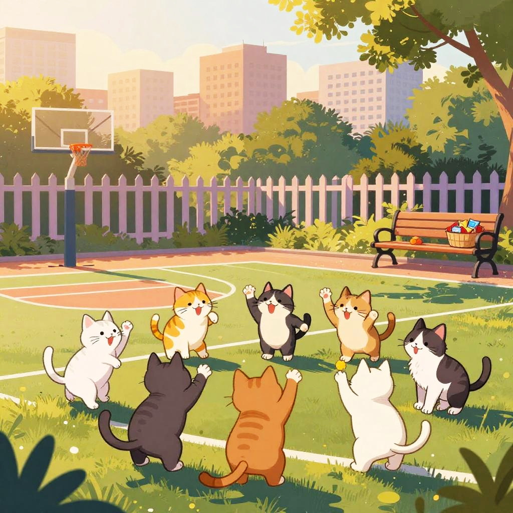 Comic book style illustration of cats practicing martial arts on a city park martial arts area, vibrant colors. Background includes city skyline with cranes, black and dark red fence, bench with skateboard, playful and energetic
