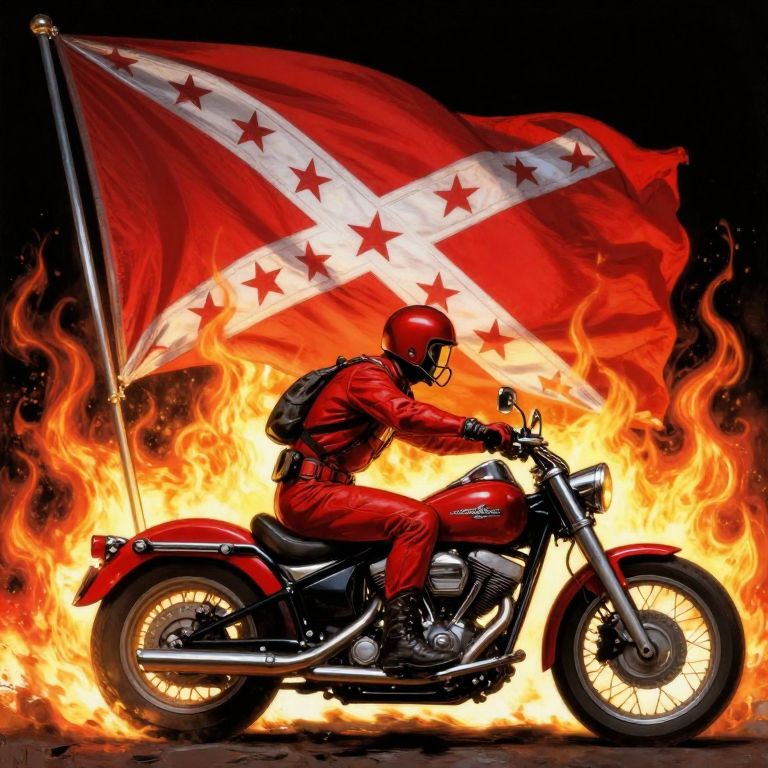 Frank Frazetta red confederate flag on a motorcycle with flames in the background and soldier riding the motorcycle,