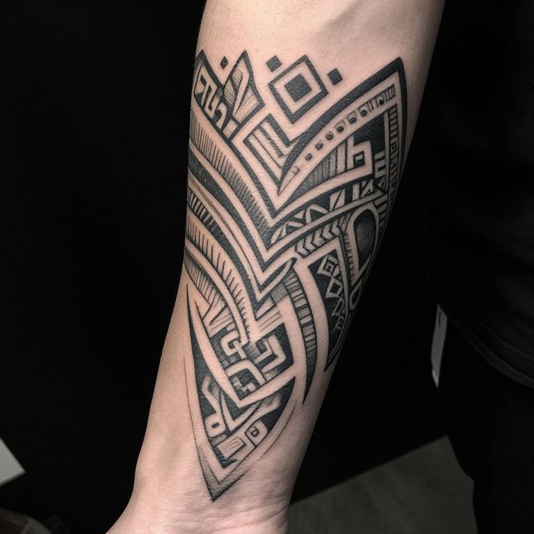 Vertical tattoos on arm featuring intricate geometric patterns and tribal designs, high contrast black ink, detailed linework, realistic skin texture, natural lighting highlighting the contours of the arm, modern artistic style, close-up perspective.