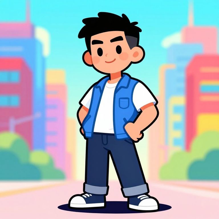 Cartoon character male standing confidently in a colorful cityscape, wearing casual modern clothes, with exaggerated expressive features, bright vibrant colors, clear outlines, dynamic pose, playful and friendly vibe, digital art style