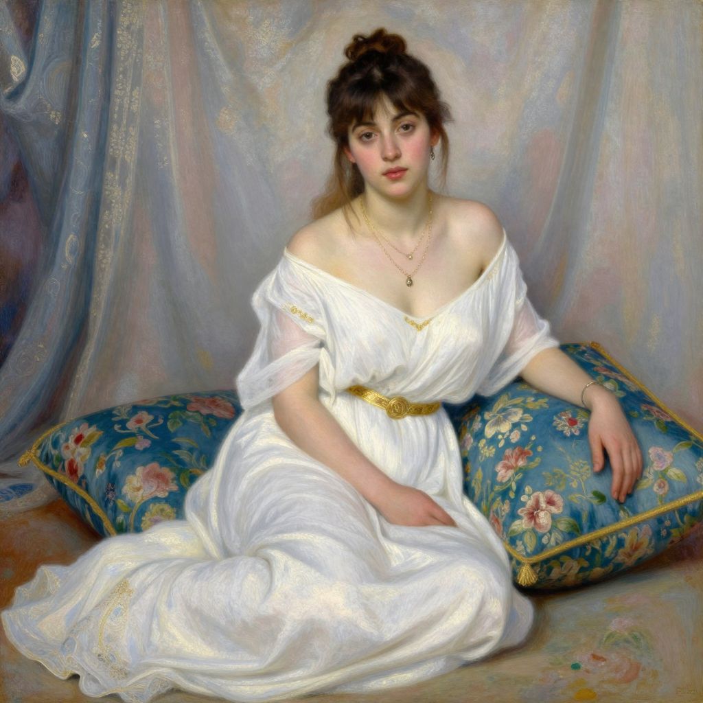 A Spanish Impressionist-inspired digital artwork featuring a woman in a flowing white dress with off-the-shoulder sleeves, adorned with a gold belt and delicate jewelry, seated on a floral-patterned blue cushion against a softly lit background with vintage-style curtains, evoking a timeless and romantic aesthetic reminiscent of Nydia Lozano's figurative paintings.