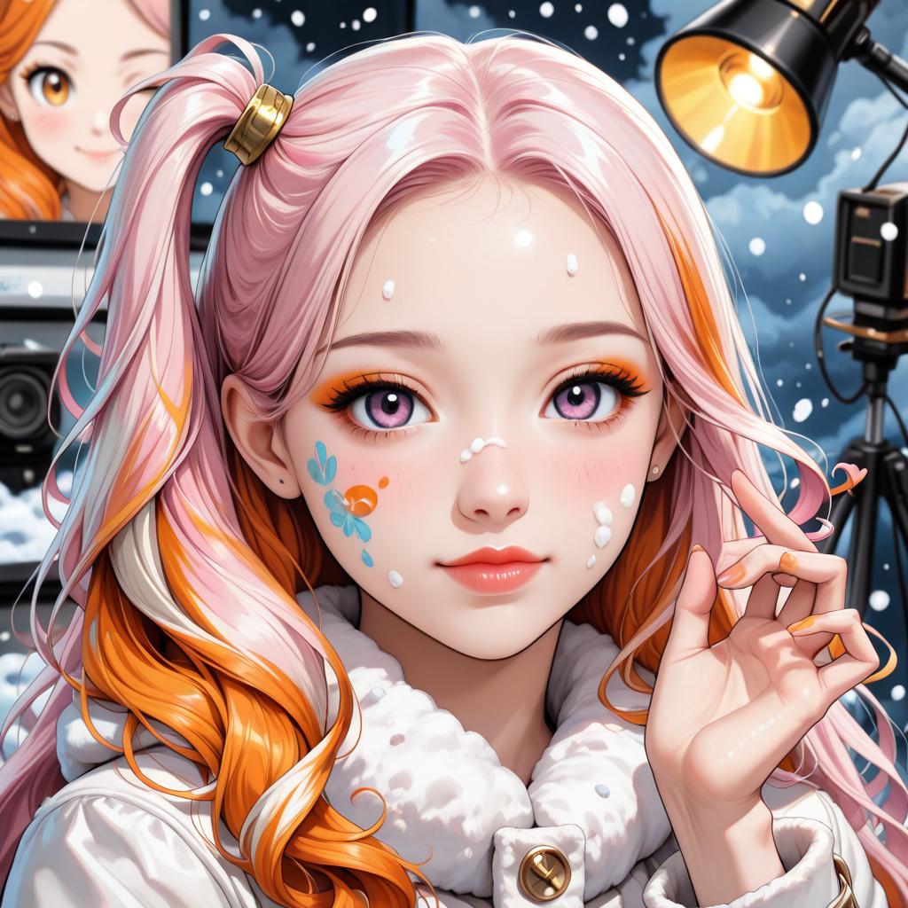 This is a digital anime-style illustration of a young woman with long, wavy, pastel pink and orange hair, secured with a gold hair clip. She has large, purple eyes, light skin, and a small, playful smile. Her cheeks are adorned with colorful, star-shaped face paint. She is wearing a white coat with a fluffy collar. In the background, there is a blurry image of another anime character in a screen, a yellow-lit spotlight, and a camera on a tripod, all set against a snowy, blue night sky. The illustration has a vibrant, glossy finish, with detailed shading and highlights.