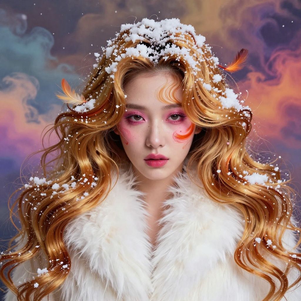 1girl, moyou, masterpiece, golden and orange swirling vortexes colourful cloudy and smoke and colorful background, (snowing) (( swirling vortexes colourful hair)), wear white fur coat, ((long Hair)), ((right side)), emotional face, close up, studio light, studio, (((makeup portrait, pink eye shadow))), ((with many golden and orange swirling vortexes colourful snow and feather on face))