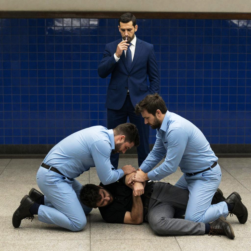 Three men in an underground subway station with blue tiled walls. One man in a blue suit stands, smoking, while two men in light blue suits kneel on the floor, wrestling with a fourth man in gray pants and a black shirt, who is lying on the ground. The kneeling men's faces are intense and focused.