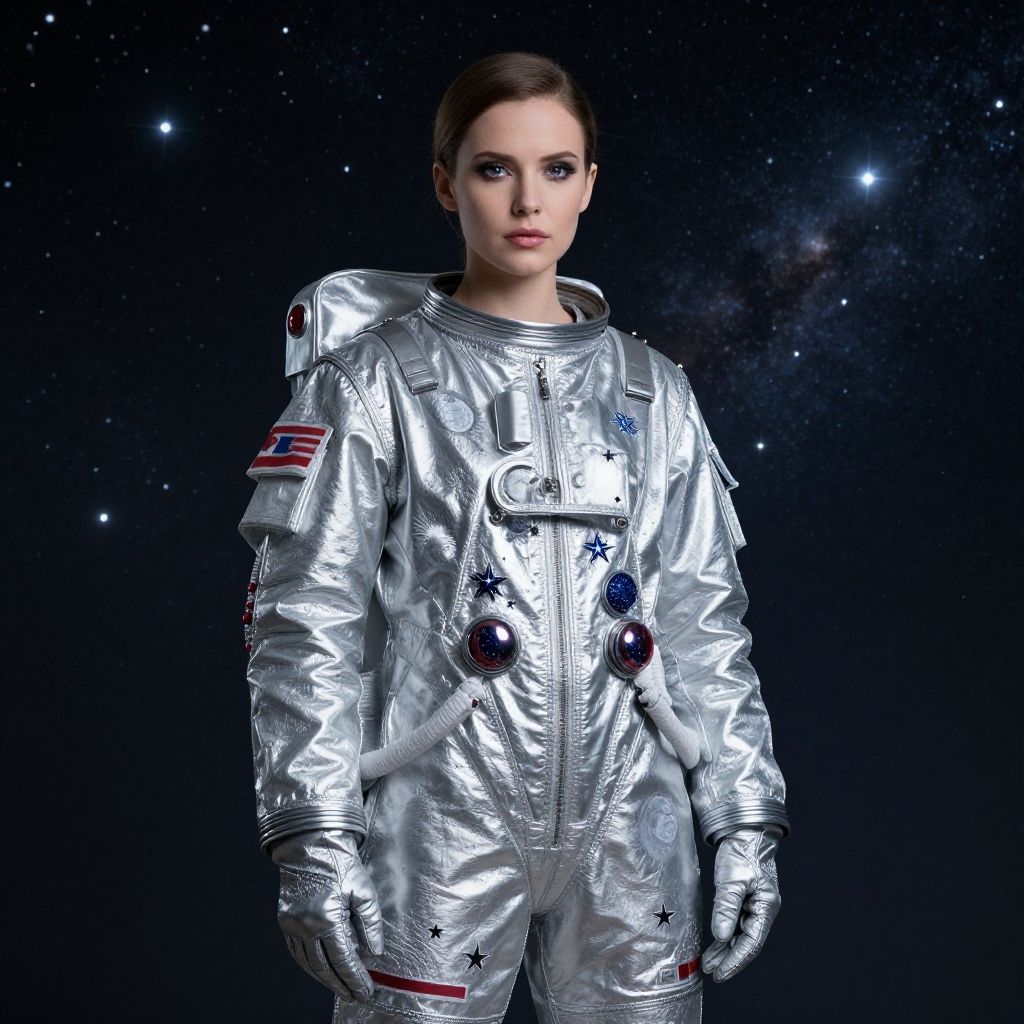 Photograph of a young woman with fair skin and dark brown hair, neatly pulled back, standing against a starry black background. She wears a silver, reflective, full-body astronaut suit with multiple black buttons, red and blue patches on the arms, and white gloves. Her expression is serious and focused. The suit's texture is metallic and crinkled, with a high-gloss finish that reflects light. The background is dotted with bright white stars, adding a cosmic atmosphere to the image. The overall composition is dramatic and futuristic, emphasizing her role as an astronaut.