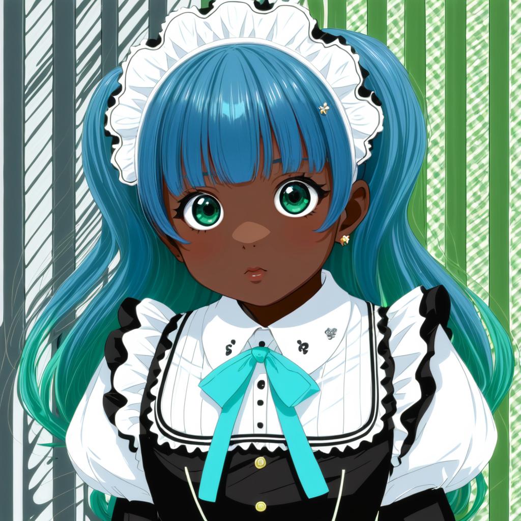 Digital anime-style illustration of a young female character with dark skin, long blue hair tied in twin tails, and large green eyes. She is wearing a classic black and white maid outfit with a white frilled maid headdress, detailed with a turquoise ribbon bow on the chest. The background features a pattern of alternating green and gray vertical stripes.