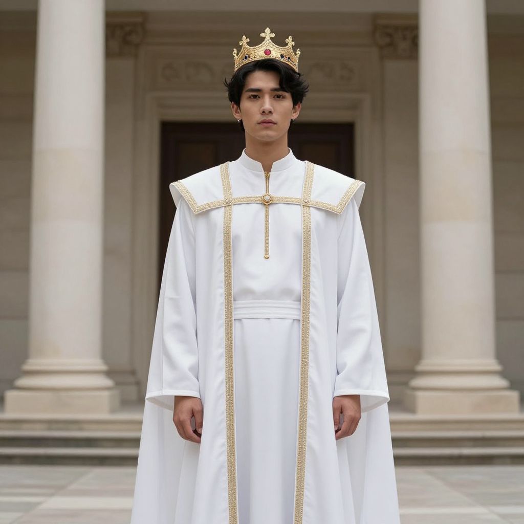 Photograph of a young man standing in front of a classical stone building with large columns. He has short black hair, light olive skin, and a neutral expression. He wears a white, long-sleeved ecclesiastical robe with gold trim and a gold crown with intricate designs. The robe has a high collar and a cross on the chest. The background features a marble floor and a large, dark entrance. The lighting is natural, highlighting the white robe and gold accents. The overall style is formal and regal.