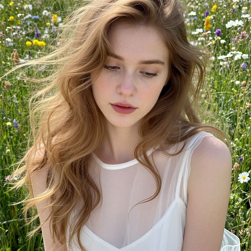Photograph of a young Caucasian woman with long, wavy light brown hair and fair skin, standing in a sunlit meadow filled with colorful wildflowers. She is wearing a sheer white sleeveless top that reveals a hint of her chest. Her eyes are closed, and she has a serene expression with slightly parted pink lips. The sunlight casts a soft glow on her hair and face, highlighting the natural beauty of the scene. The background is a blur of green grass and vibrant yellow, white, and purple flowers, creating a peaceful, dreamy atmosphere.