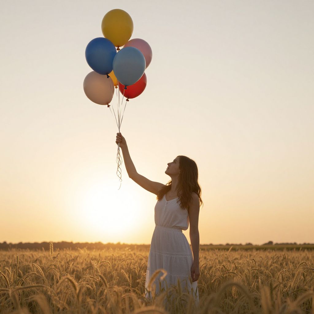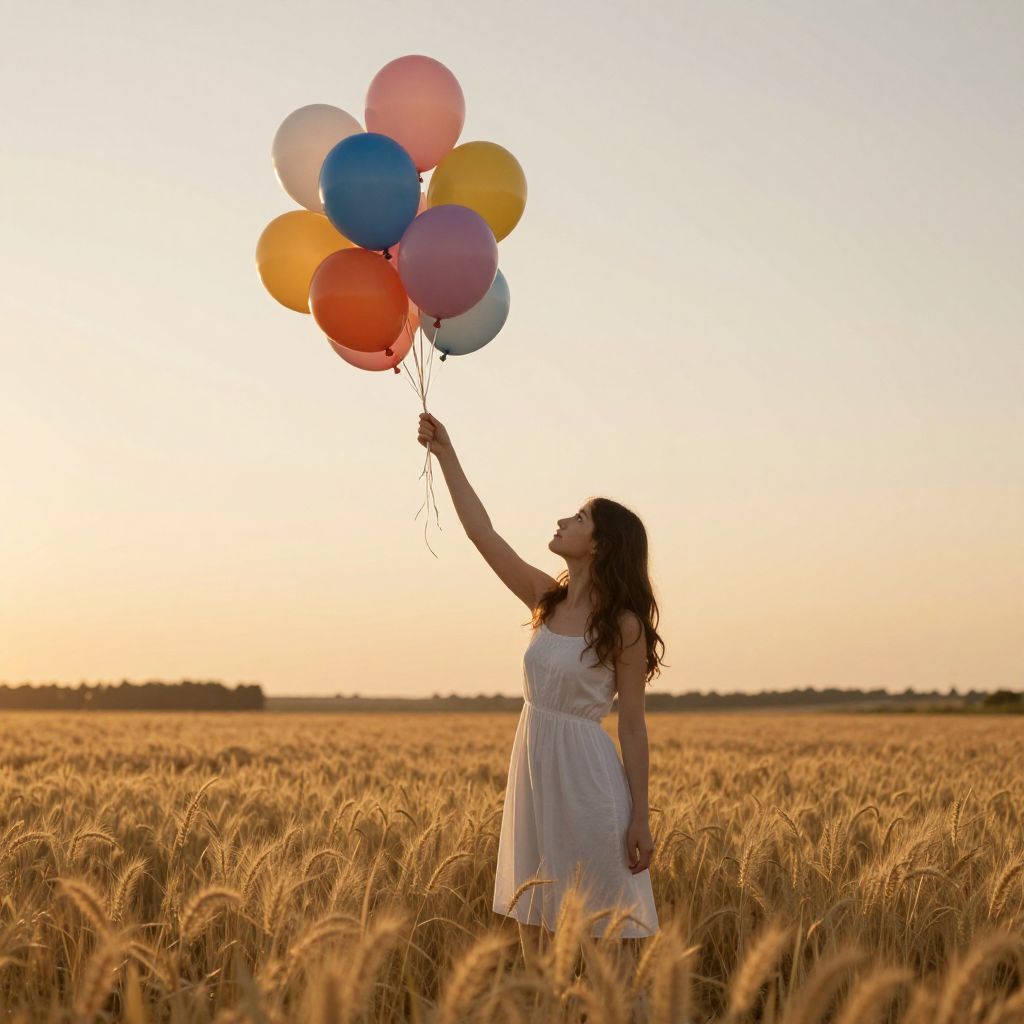 Amidst a golden field bathed in the soft glow of sunset, a woman holds colorful balloons, embodying a delicate balance of serenity and yearning, as if tethered to dreams that float just beyond her grasp.