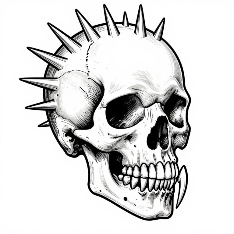 Detailed line drawing of a skull tattoo design featuring sharp, radiating spikes above the head, intricate shading around the eye sockets, and elongated, pointed teeth extending downward, rendered in bold black lines against a stark white background.