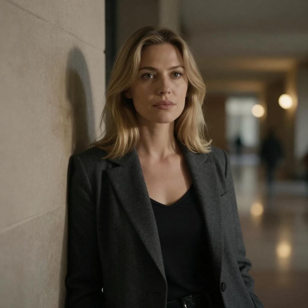 Photograph of a woman with shoulder-length blonde hair, wearing a dark gray blazer over a black top, standing against a stone wall. She has a pensive expression, with soft lighting casting shadows. The background features a blurred, warmly lit interior with reflective floors and illuminated fixtures.