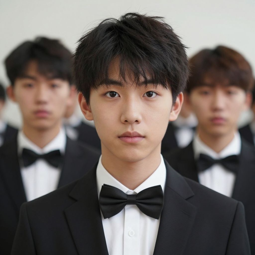 Photograph of a young Asian man with black, slightly messy hair, wearing a black tuxedo with a white shirt and black bow tie. He stands in the foreground with a neutral expression. Blurred in the background are two other young Asian men, also wearing black tuxedos with white shirts and black bow ties. The background is a plain, light-colored wall, placing full focus on the subjects. The image has a sharp focus on the central figure, with a shallow depth of field, creating a slight blur effect on the background figures.