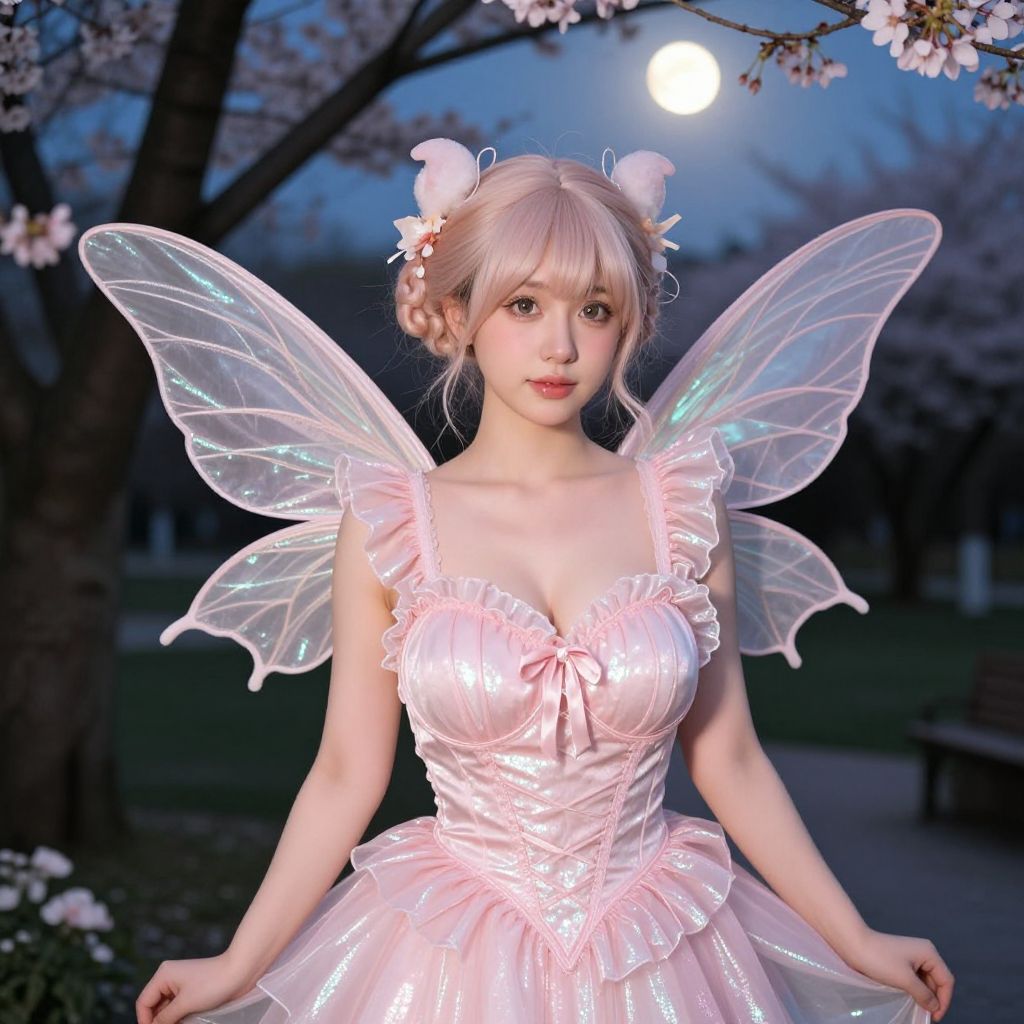 Photograph of an Asian woman with light skin and long, blonde hair styled in two buns adorned with white flowers. She wears a pink, ruffled, strapless fairy dress with a fitted bodice and a voluminous skirt. Her translucent, iridescent wings reflect a glowing blue light. The background features a twilight garden with a full moon, cherry blossom branches, and blurred trees. The woman's expression is serene, and she stands with her arms gently resting at her sides. The image has a magical, ethereal quality, enhanced by the soft lighting and delicate textures.