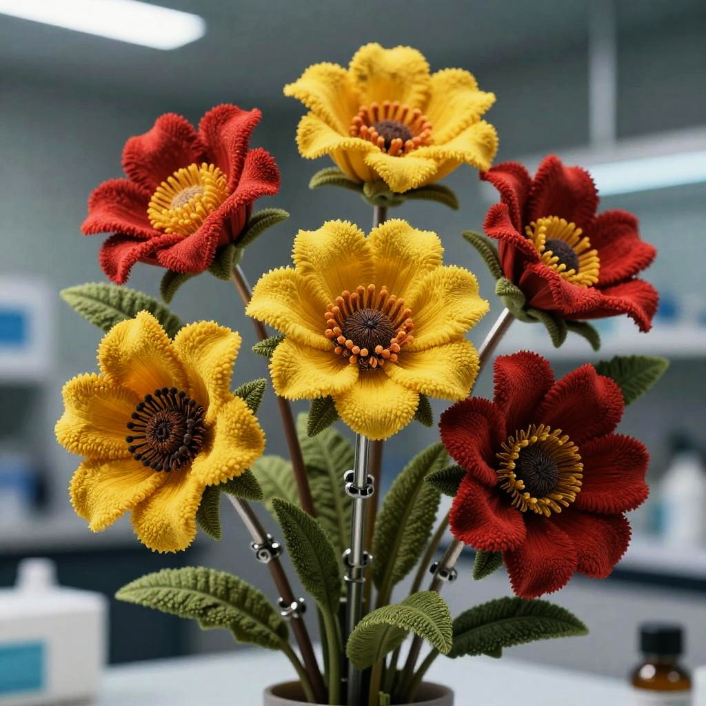 Close-up of AI flower generator output, hybrid flowers with mechanical stems and organic petals, bright color palette of reds, yellows, and greens, detailed texture combining natural and synthetic elements, softly illuminated in a dark lab environment