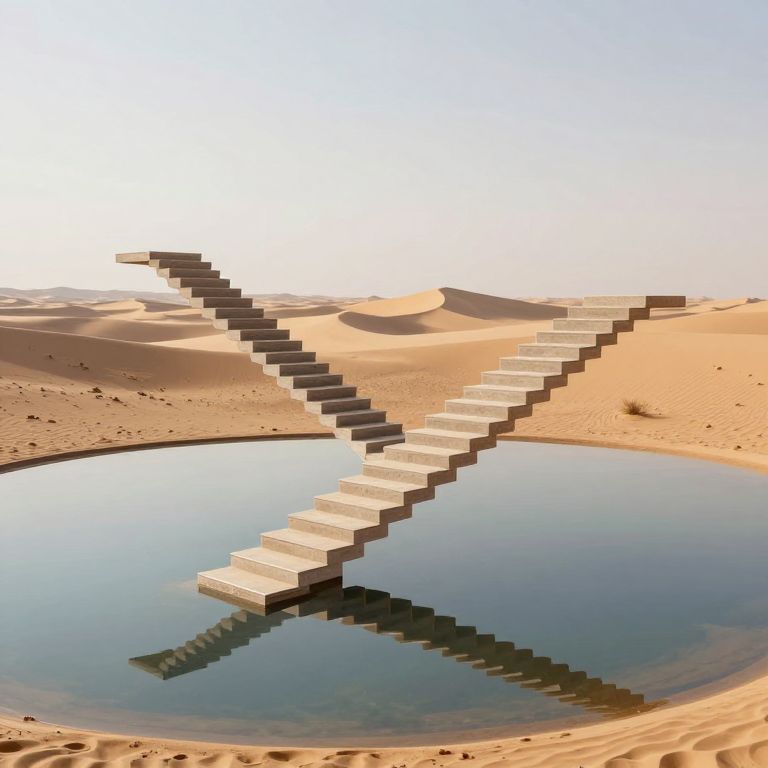 This digital artwork depicts a surreal desert landscape with a large, reflective circular pool in the foreground. A stepped, stair-like structure made of rectangular blocks extends diagonally from the pool's edge into the sandy, sunlit desert, creating a stark, shadowed reflection in the water. The background features undulating sand dunes under a clear, pale blue sky. The image employs a realistic yet slightly stylized approach, with sharp contrasts between the bright desert and the reflective pool. The overall composition evokes a sense of isolation and geometric harmony in a barren, arid environment.