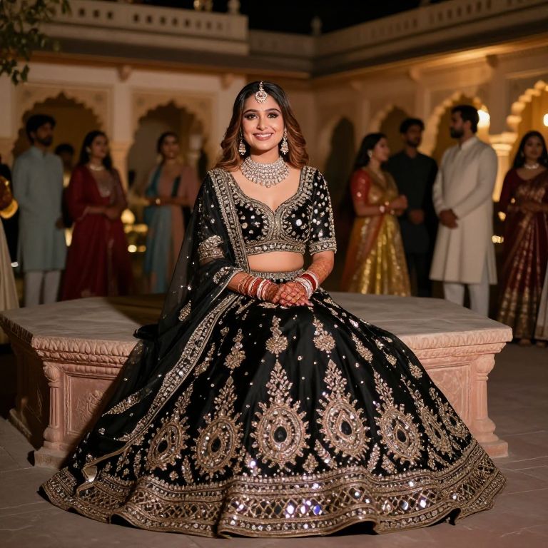 A glamorous bride in her late 20s with soft brown hair and a radiant smile, dressed in a rich black lehenga with a high neckline and elaborate mirror work, sitting on a traditional stone platform in a heritage-style Indian courtyard during an evening engagement celebration with guests in traditional attire