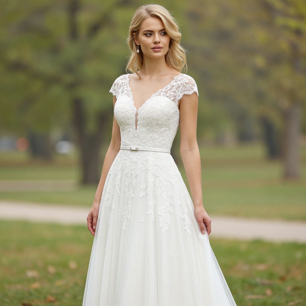 Photograph of a blonde woman standing outdoors in a park. She is wearing a white, lace, V-neck, short-sleeved wedding dress with a fitted bodice and a full, flowing skirt. Her hair is styled in a loose updo with soft curls framing her face. The background features blurred greenery, including trees and a grassy area with a path. The lighting is natural, and the overall mood is serene and elegant. The woman's expression is neutral, and she stands with her arms relaxed by her sides.