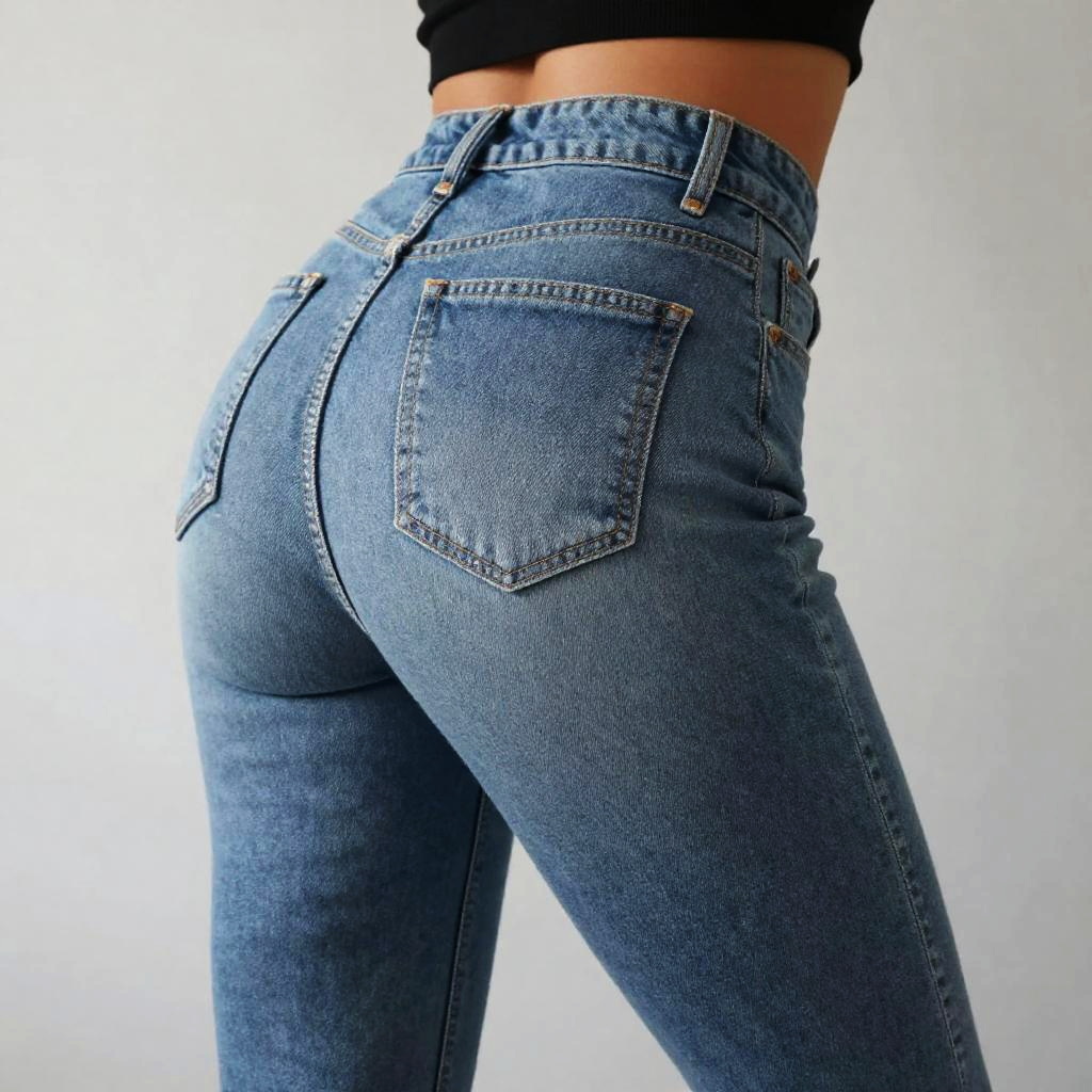 Ass in tight jeans, soft focus portrait with emphasis on fabric detail, cool toned lighting, minimalist studio setting, contemporary casual fashion look, high detail rendering