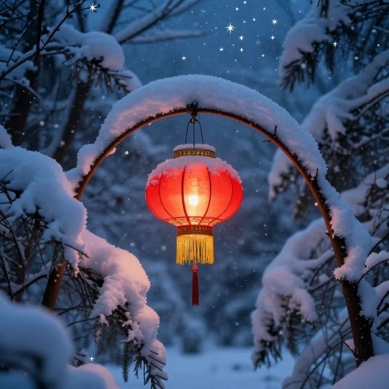 Photograph of a snow-covered winter night scene featuring a red, glowing paper lantern with yellow fringe hanging from a curved wooden arch. The lantern is centered and illuminated, casting a warm light amidst the dark blue and white snowy background. Snow-dusted evergreen trees frame the scene, with small, twinkling star-like lights scattered in the sky above. The contrast between the warm lantern light and the cool, dark surroundings creates a magical, serene atmosphere. The texture of the snow and branches is clearly visible, adding to the wintery feel.