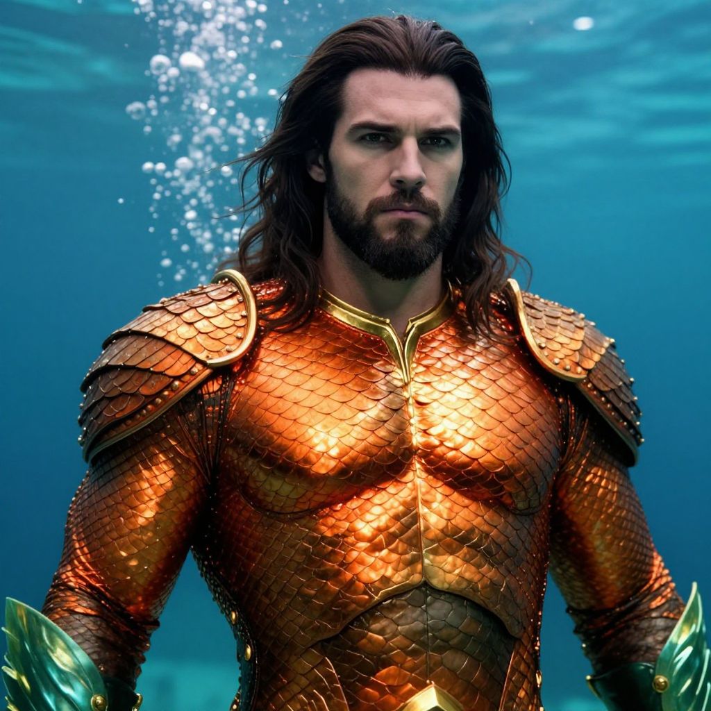 Photograph-like CGI image of a muscular, bearded man with long, wavy brown hair wearing a golden, scale-patterned, armored chest plate and shoulder guards. The armor shimmers under water, reflecting light. He has a stern expression and is underwater, with blue water and bubbles in the background. His arms, partially visible, are adorned with green, leaf-like appendages. The overall style is reminiscent of a fantasy or superhero character, evoking a powerful, aquatic warrior aesthetic. The lighting highlights the metallic texture of the armor.