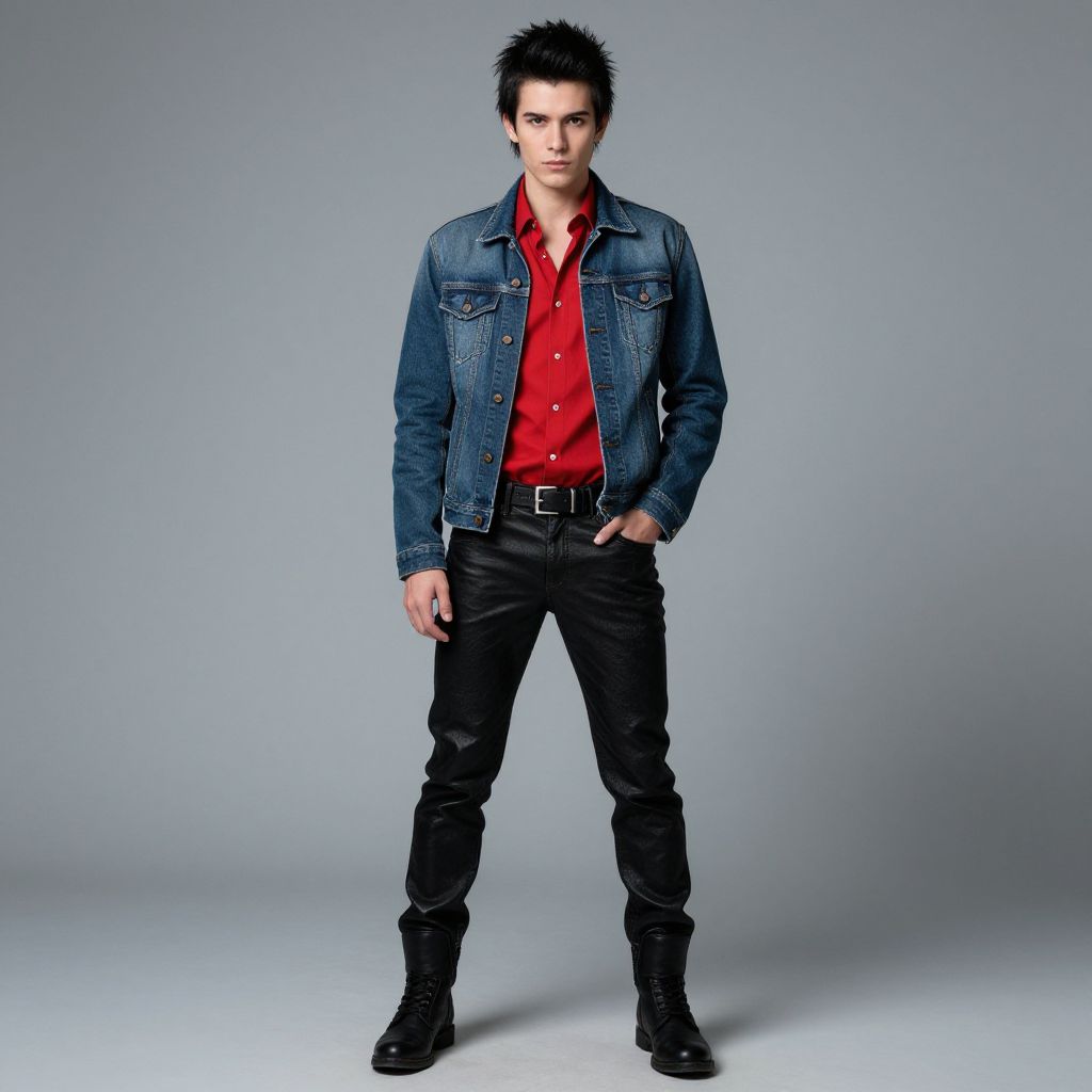 "punk costume boy, 1boy, male focus, solo, denim, jacket, leather, jeans, hand in pocket, black hair, pants, denim jacket, shirt, boots, leather jacket, belt, standing, full body, realistic, red shirt Realistic photo of casual sexy person with pretty face"