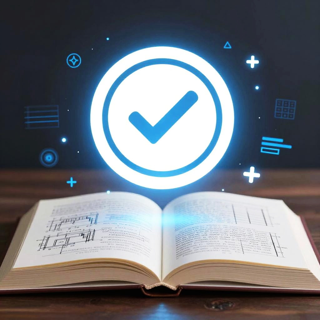 A glowing certified badge icon floating above an open book with technical drawings, surrounded by abstract digital elements in a futuristic style, blending traditional knowledge and modern technology with vibrant blues and whites.