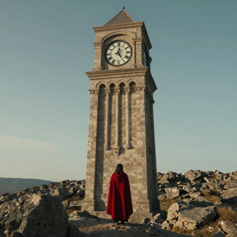 A timeless clock tower emerges defiantly from a rugged landscape, its stone facade adorned with arches and columns, while a solitary figure draped in a crimson cloak stands before it, as if guarding the passage of an eternal, otherworldly hour.