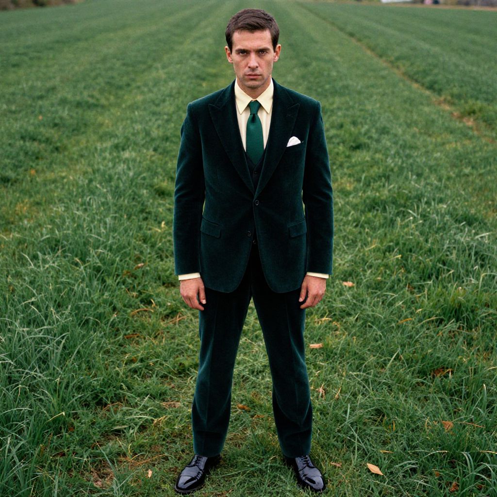 A man, deep green velvet three-piece suit, cream silk dress shirt, dark green silk tie, black patent leather derby shoes, lush green fields, technicolor analog film stock, confident expression Man has masculine face and piercing eyes