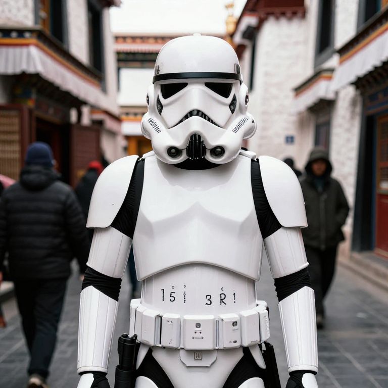 "Potion Imperial stormtrooper on the streets of Lhasa, street photography, contrasting colors, imposing presence, narrow depth of field, natural lighting, Fujifilm X-T4, 35mm f/1.4,"