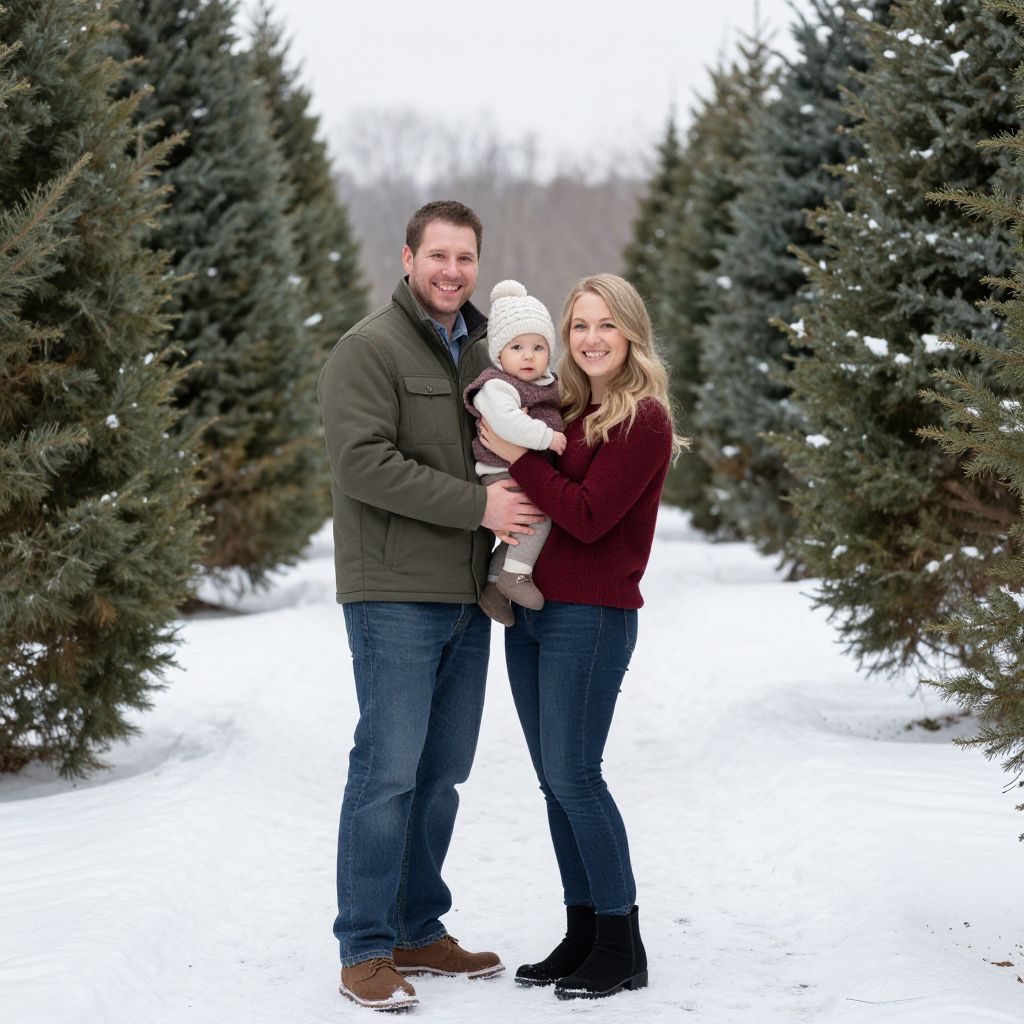 Photograph of a smiling family of three standing in a snowy Christmas tree lot. The father, with short brown hair and a beard, wears a green jacket and blue jeans. The mother, with long blonde hair, wears a maroon sweater and blue jeans. She holds a bundled-up baby with white hair and a knit hat, dressed in a white coat and gray pants. They are surrounded by tall, green evergreen trees on both sides, with a white, snowy path in the center. The background is blurred, showing more trees and a gray, overcast sky.