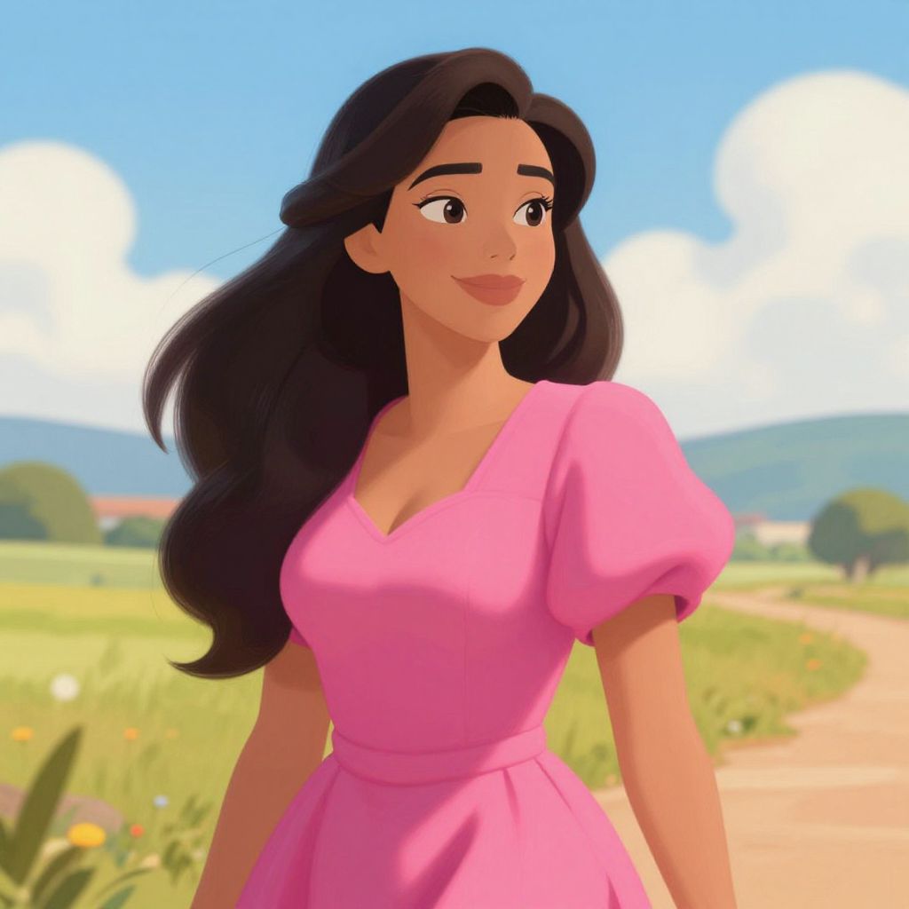This is a digital illustration in a Disney-style animation. It features a young woman with long, wavy, dark brown hair and large brown eyes, smiling gently. She wears a pink, V-neck, short-sleeved dress with a cinched waist and a full skirt. Her skin is light brown. She stands on a dirt path in a vibrant, sunny countryside setting with green fields, yellow wildflowers, and a blue sky with white clouds. The background is slightly blurred, emphasizing her as the focal point. The overall style is bright, colorful, and cheerful, reminiscent of classic Disney animation.