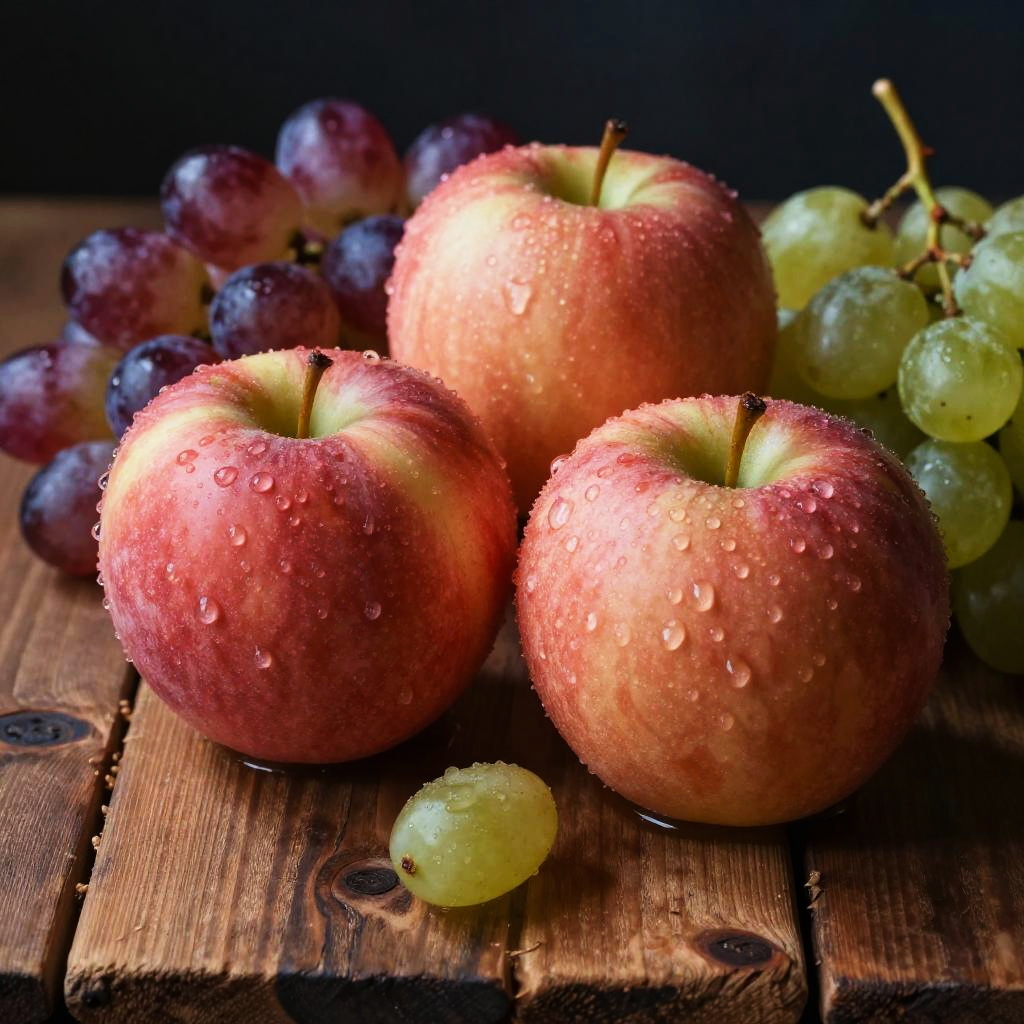 Hiper realismo still life of fresh fruits on a rustic wooden table, dew drops on the skin of apples and grapes, richly textured backgrounds, extreme detail in surface reflections