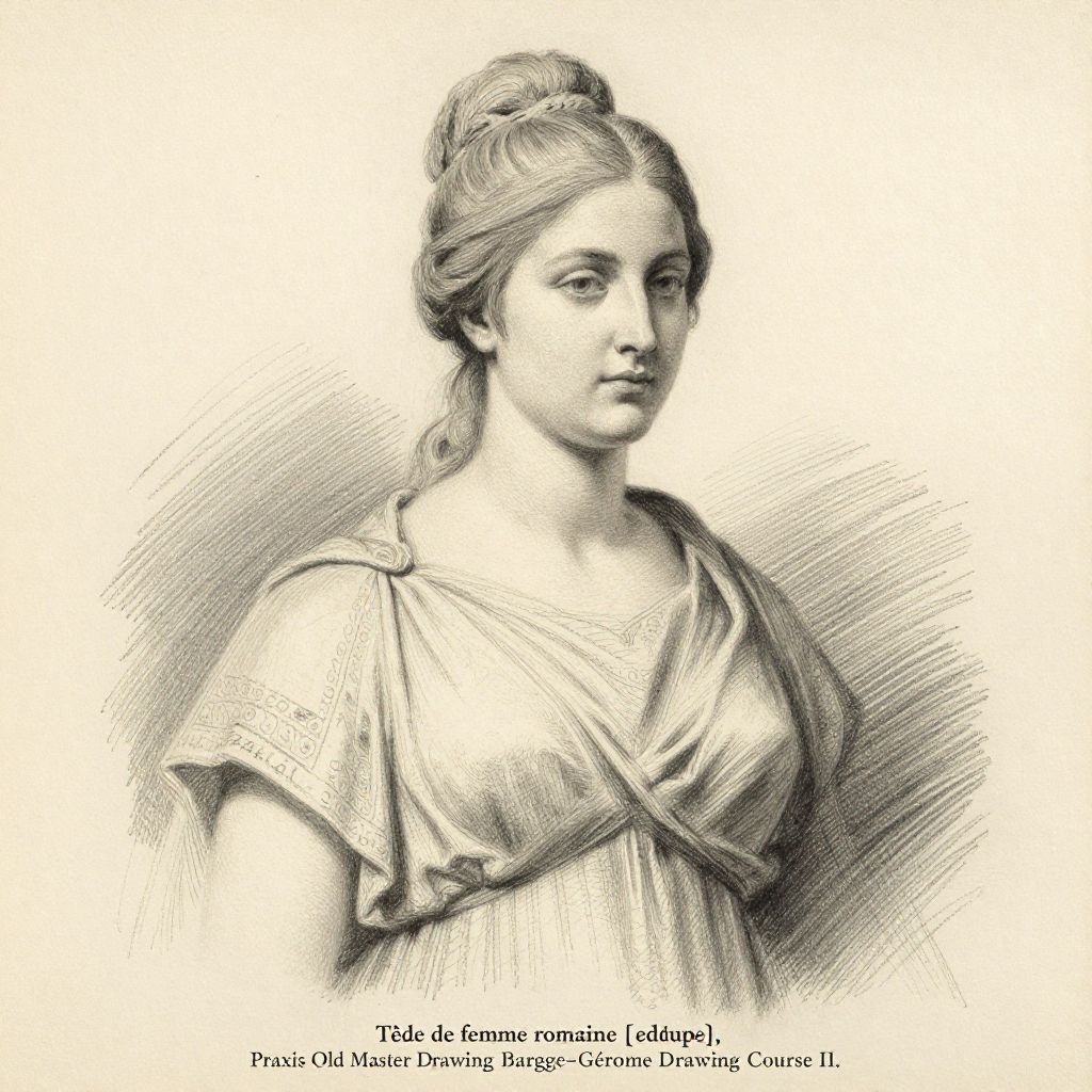 Elegant pencil sketch of a Roman woman by Adolphe-William Bouguereau (1825-1905), showcasing her classical hairstyle and draped attire, titled \"Tête de femme romaine [étude],\" part of the Praxis Old Master Drawing Bargue-Gérôme Drawing Course II, with whereabouts currently unknown.