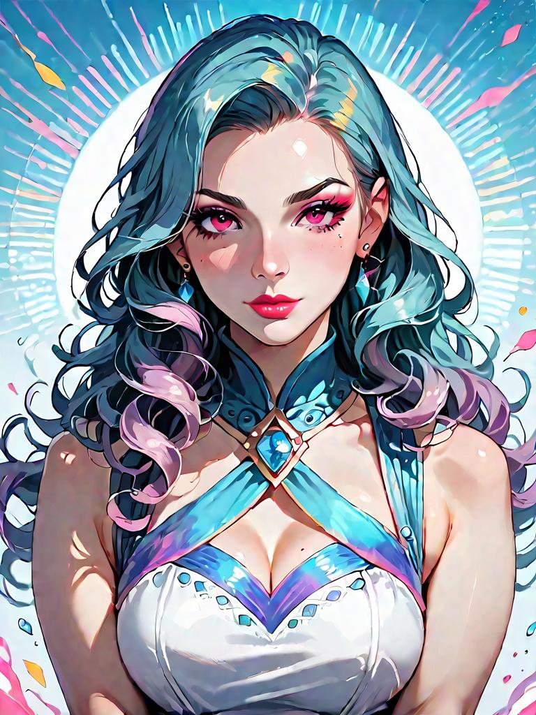 Elegant anime-style girl in teal sheer tunic and black leggings