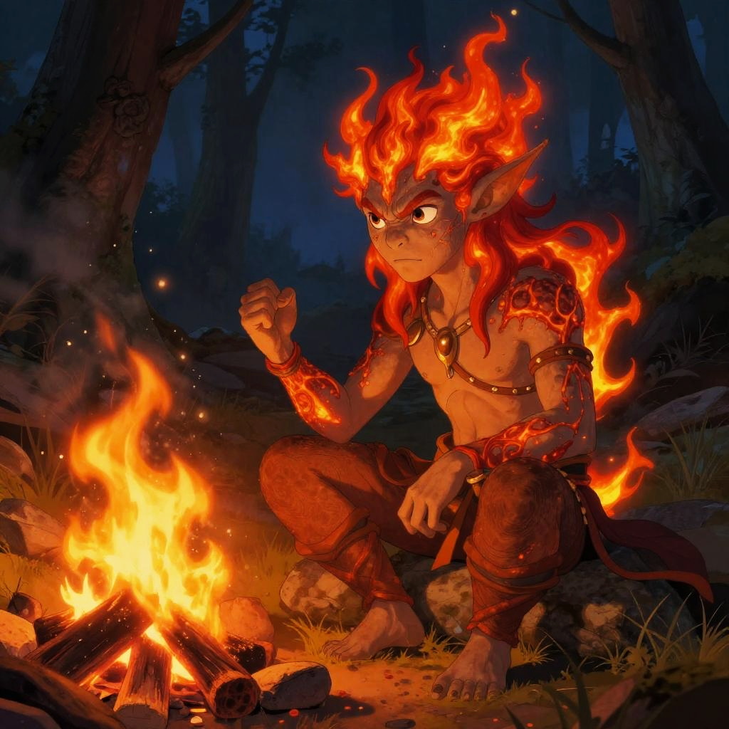 Young Fire Genasi Elemental by Campfire