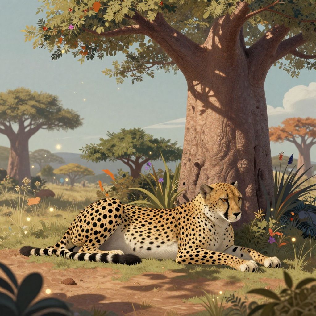Digital illustration of a resting cheetah with golden fur and black spots, beneath a large tree in a sunlit savanna. Vibrant flowers and