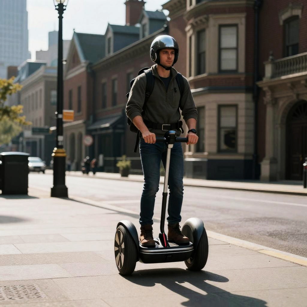 Realistic photo.A futuristic traveler riding a segway through an industrial Victorian cityscape, featuring dramatic shadows and high contrast. realistic photo