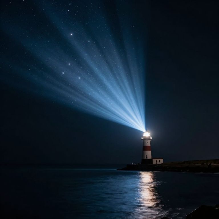 Lighthouse beams a radiant stream of celestial light into the night sky, conjuring a luminous, starry orb that casts ethereal reflections upon the tranquil waters below.