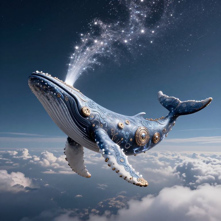 A majestic, ornately decorated whale ascends through the heavens, its body adorned with intricate patterns and mechanical details, as it spouts a trail of shimmering stardust into the cosmic expanse above the clouds.