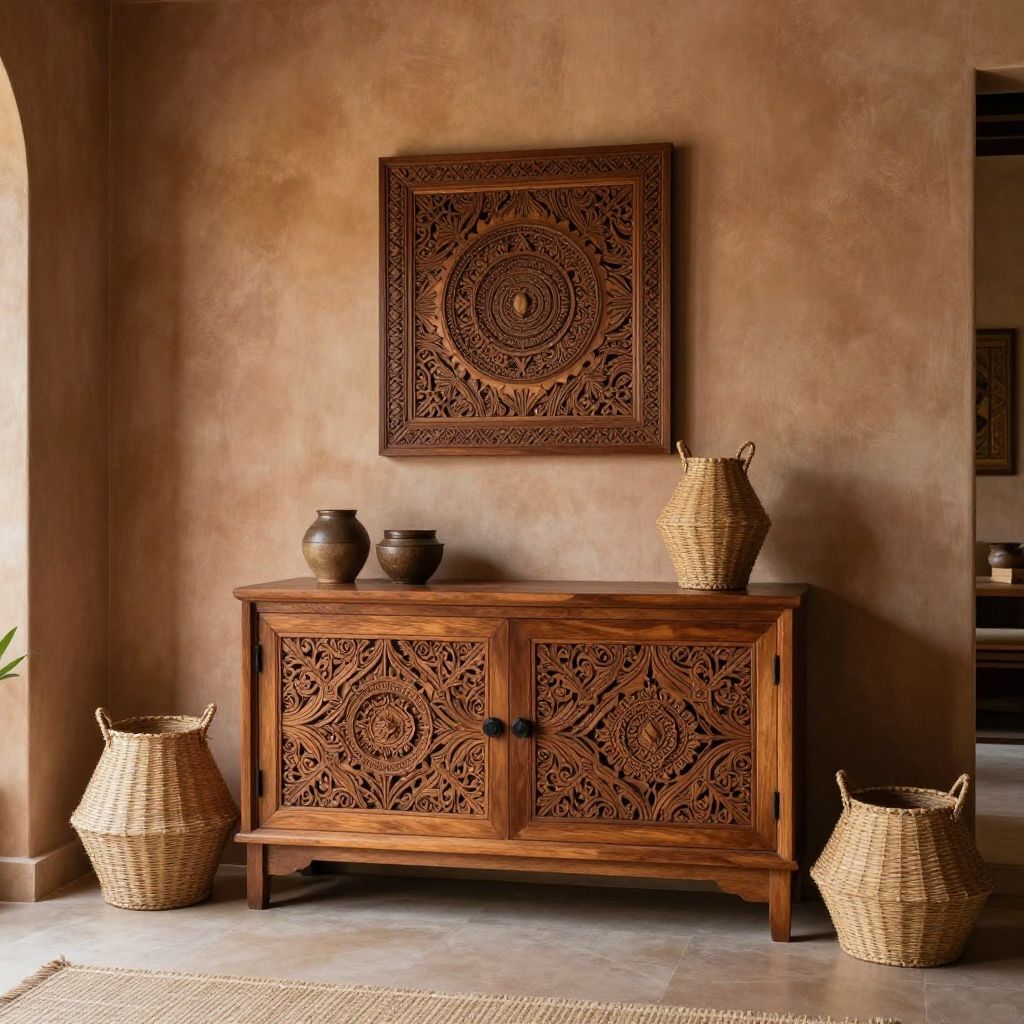 Bali style interior design using warm earthy colors, intricate wood carvings on cabinets, woven baskets, ambient natural light, combining organic materials and minimalist luxury