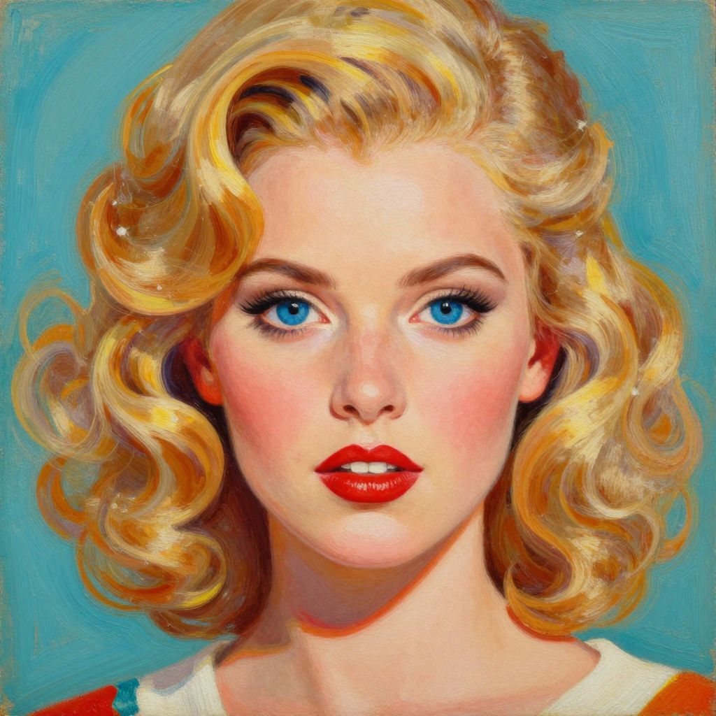 Digital pop art portrait of a blonde woman with blue eyes, red lips, and curled hair against a blue background.