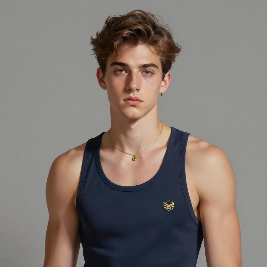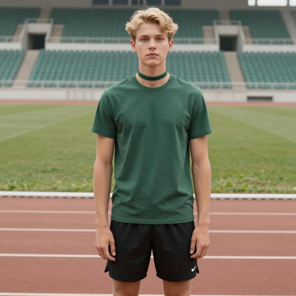 Portrait of a young male athlete wearing a green cotton t-shirt and a matching green cotton choker, standing in an empty sports stadium. The athlete has short blonde hair and light skin, dressed in casual sportswear with black athletic shorts. The background features green stadium seats and a running track around a grass field.