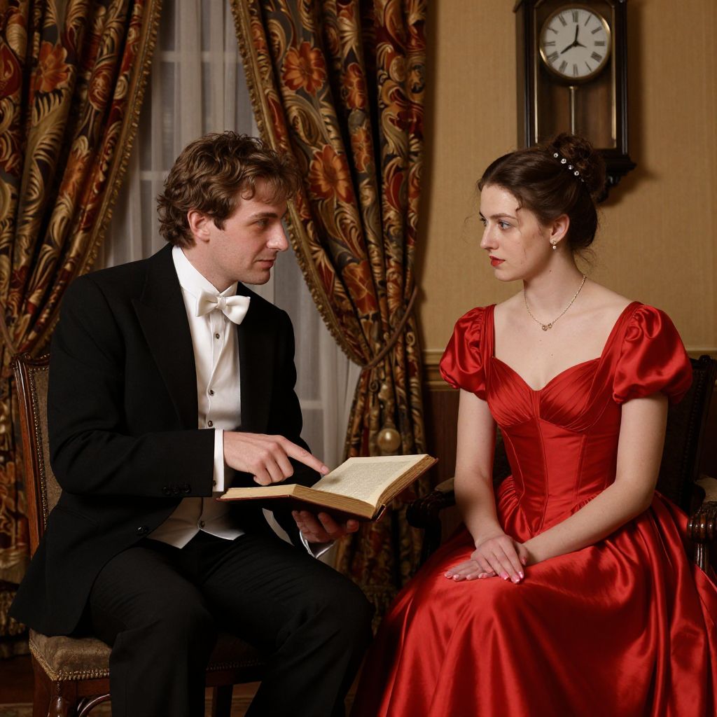 Elegant figures engage in a scholarly exchange, with a man in formal attire pointing to an open book while seated beside a woman in a vibrant red gown, set against a backdrop of richly detailed curtains, a wooden chair, and a wall-mounted clock in a warmly lit interior.