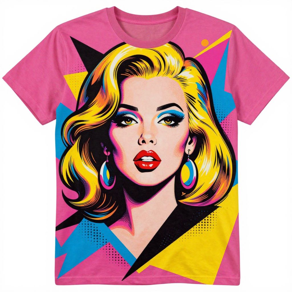 The image is a vibrant and stylized t-shirt design inspired by pop art. The central figure is a woman with voluminous, wavy blonde hair, adorned with large, round earrings. Her face is characterized by bold, exaggerated features, including large, expressive eyes with colorful accents, a prominent red lipstick, and a nose with a blue highlight. The background is a striking contrast of geometric shapes in bold colors: pink, yellow, blue, and black, creating a dynamic and eye-catching composition. The design is outlined with thick, black lines, adding a sense of depth and structure to the image. The overall composition is balanced, with the woman's face centrally positioned, surrounded by the colorful, angular shapes that frame her. The interplay of colors and shapes creates a sense of movement and energy, characteristic of pop art.