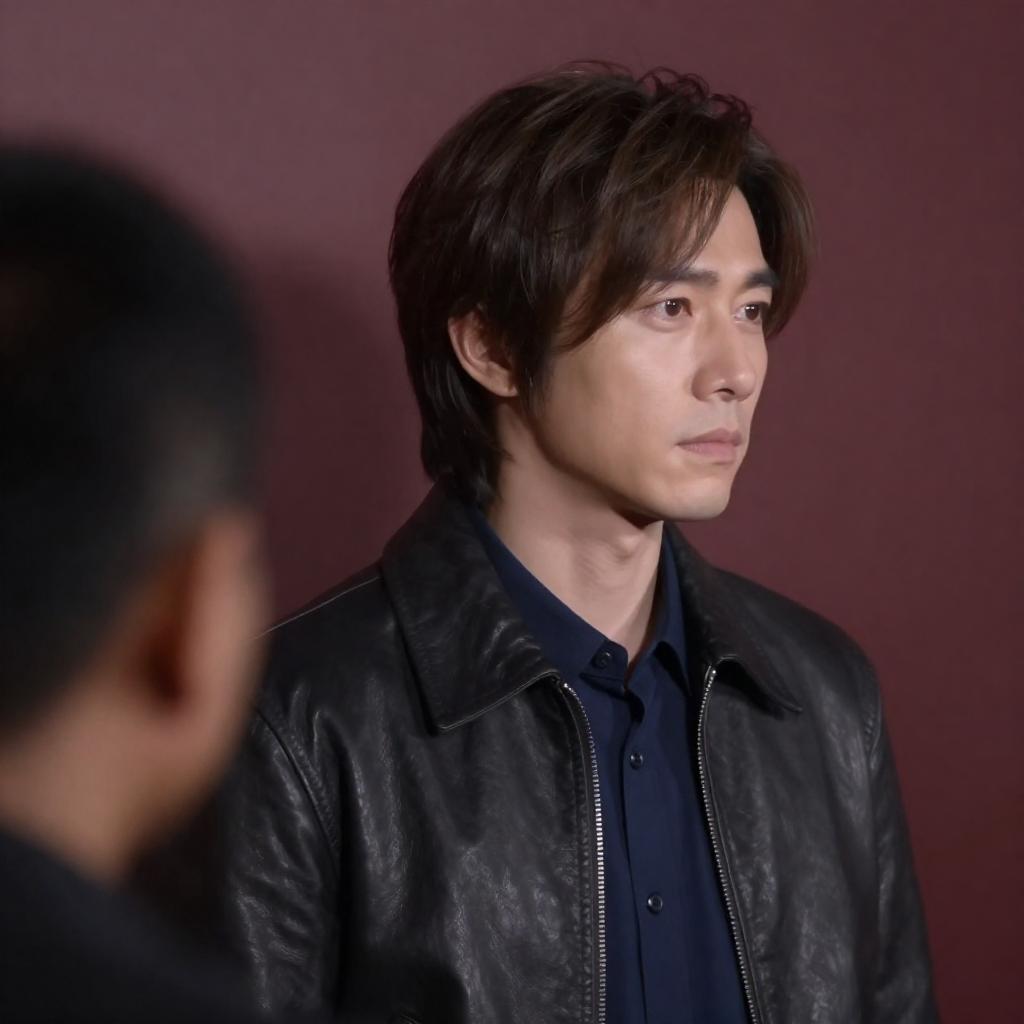 Asian man with medium-length black hair, intense downward gaze, wearing an olive green jacket over a black turtleneck, blurry background.