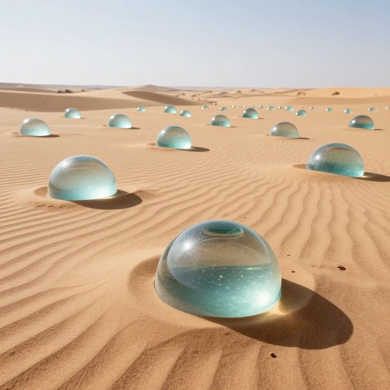 A vast expanse of desert is dotted with translucent, dome-shaped glass formations that seem to emerge from the sand like crystallized memories, defying gravity and hinting at a world where nature and artifice merge seamlessly.