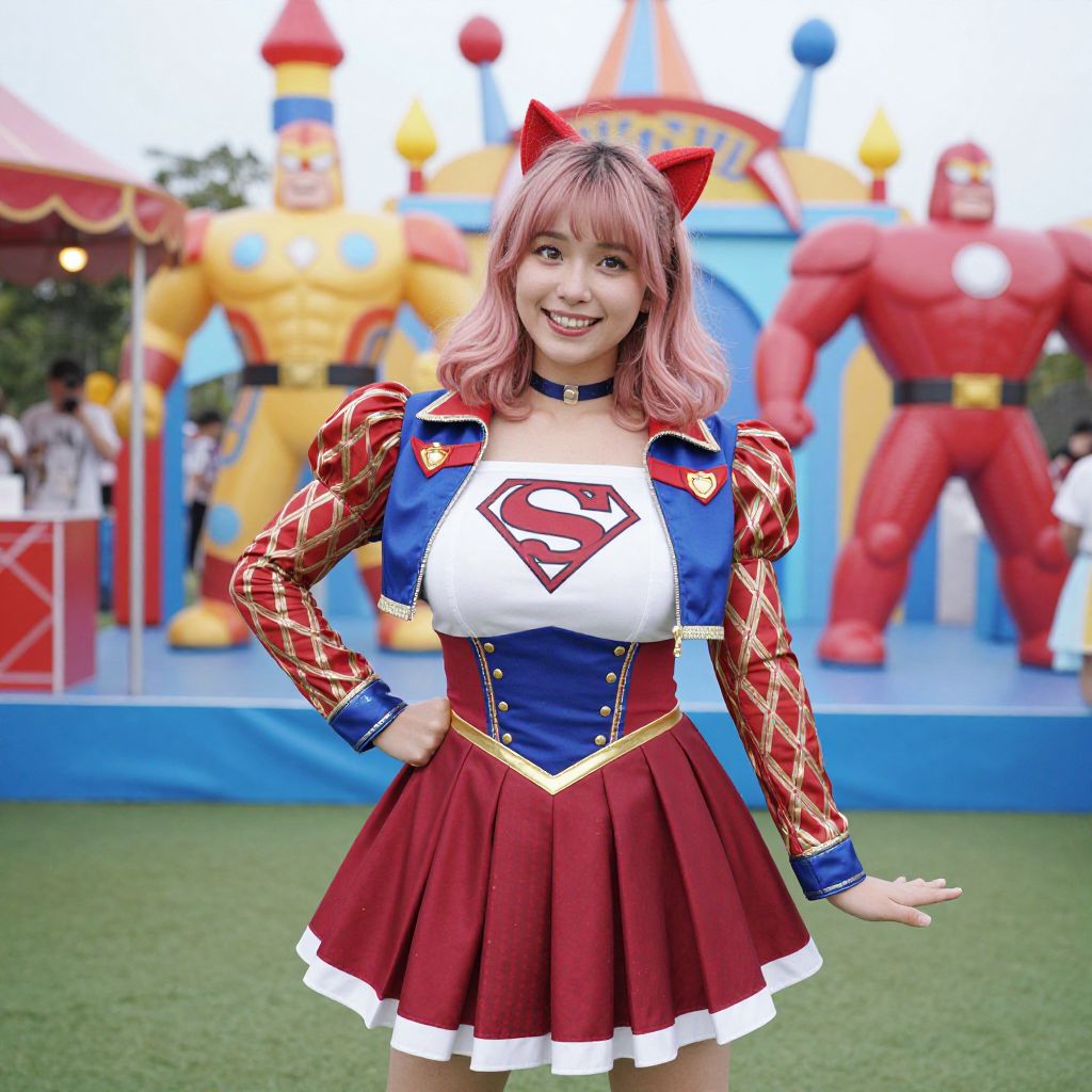 A playful woman in her early 20s with soft pink hair and a friendly smile wears a superhero theme party dress that combines a superhero jacket, a caped skirt, and a red and gold pattern on the sleeves. She is posing in a colorful carnival-style outdoor party with giant inflatable superheroes and themed booths in the background.. The woman has big breasts and cute face