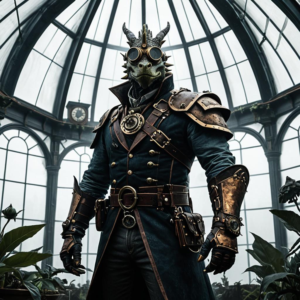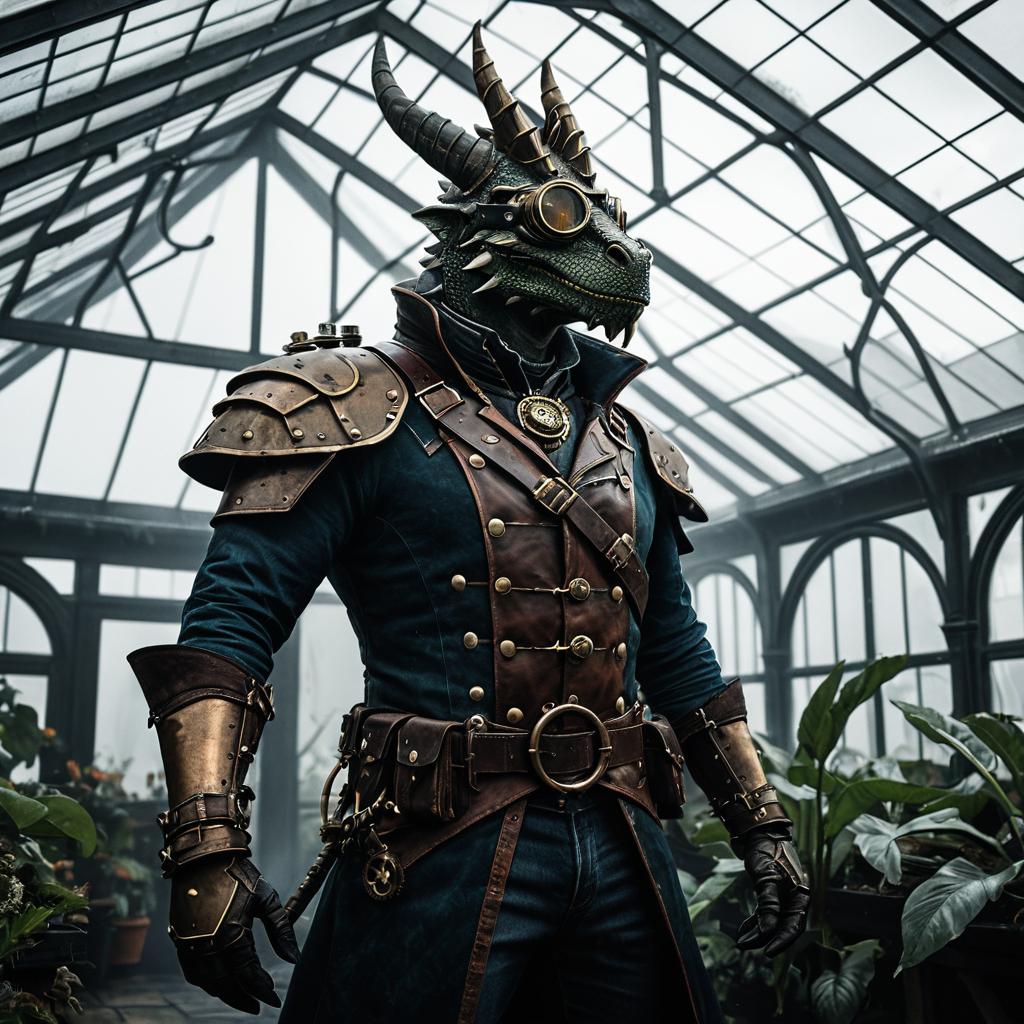 Digital artwork of a majestic anthropomorphic bronze-scaled dragonborn character standing confidently inside a fog-covered Victorian-style greenhouse. The character is dressed in a detailed leather harness and armor with steampunk-inspired goggles and metallic horns, bathed in cinematic chiaroscuro lighting. The scene features sharp focus and a matte finish, combining elements of fantasy and steampunk concept art.